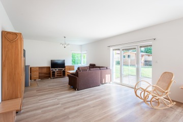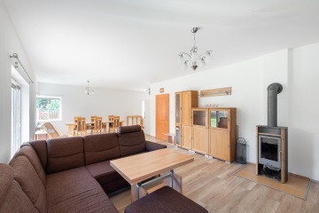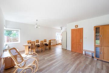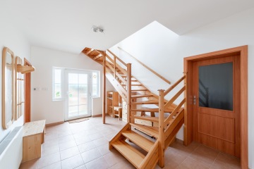 Dům je navržen s ohledem na praktické využití každého metru. Dispozice domu je promyšlená a dobře organizovaná, což umožňuje pohodlné a harmonické bydlení. Prostorný obývací pokoj s krbovými kamny a kuchyňským koutem (46,20 m2) s přímým vstupem na slunnou terasu je ideálním místem pro společné rodinné chvíle, odpolední kávu nebo grilování s přáteli. Kuchyně je původní a je propojena s jídelním koutem, což oceníte při rodinných večeřích i každodenním vaření. V 1. NP dále naleznete pracovnu / hostinský pokoj (12,25 m2), koupelnu se sprchovým koutem, toaletou a plynový kotel, který zajišťuje vytápění i teplou vodu (5,76 m2). Dále prostornou chodbu se schodištěm do 2. NP (13,50 m2).