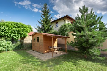 Zahrada obklopující dům je udržovaná a nabízí dostatek prostoru pro hry dětí, zahradničení, nebo jen pro relaxaci s knihou v ruce. Zahradní domek s přístřeškem pro uskladnění všeho potřebného a posezení jako bonus.