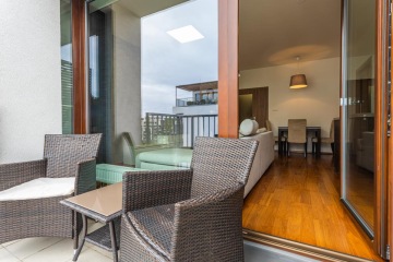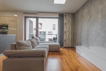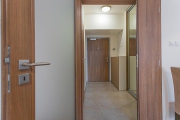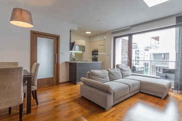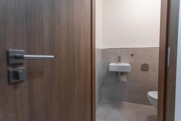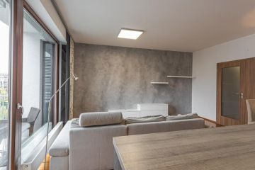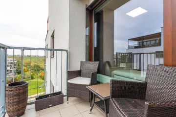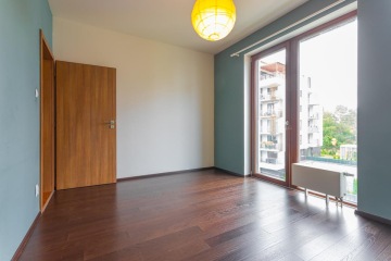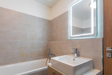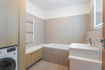 V samostatné koupelně je vana, umyvadlo a pračka. Dostatek úložných prostorů včetně vestavěných skříní je další velkou výhodou. Byt je k dispozici ihned a nabízí se jako částečně zařízený. Měsíční zúčtovatelné poplatky činí 4.500,- Kč.