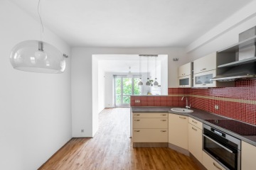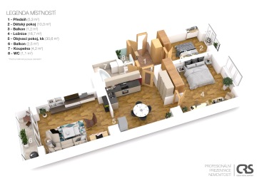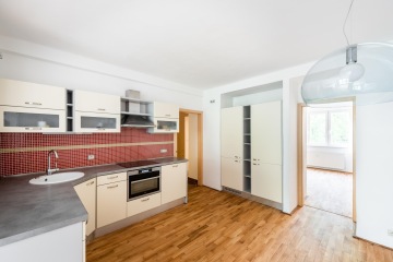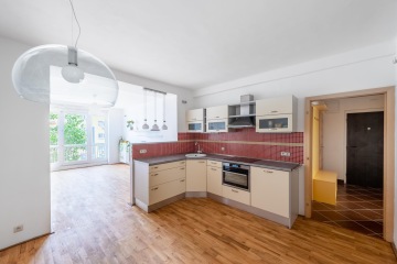 První pokoj, který může sloužit jako dětský, pracovna či pokoj pro hosty nabízí balkon (1,2 m2) s výhledem do klidného vnitrobloku, který je také ke společnému užívání (severní strana). Ložnice je prostorná a je v ní velká vestavěná skříň. Výhodou jsou neprůchozí pokoje, které nabízí klid a soukromí. (vhodné také k investici a následnému pronájmu jednotlivých pokojů). Posledním, třetím pokojem je obývací pokoj s kuchyňským koutem a jídelní částí. Kuchyň je vybavena zánovní myčkou, kombinovanou troubu s mikrovlnou troubou a varnou deskou s digestoří. Lednice s mrazákem jsou vestavěné. Spíš je dostatečně velká a praktická. Z obývacího pokoje se dostanete na druhý balkon (2,5 m2), orientovaný na jižní stranu.