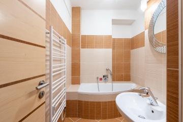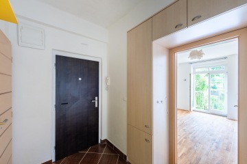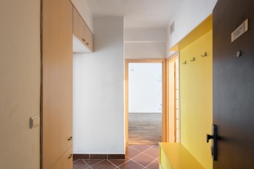 Postuponou rekonstrukcí prošel do stávající podoby - nové rozvody, moderní kuchyňská linka, vestavěné skříně, renovace parket a další. Po vstupu do bytu skrze bezpečnostní dveře vejdete do chodby s úložnými prostory. Koupelna má vanu a je možné zapojit podlahové vytápění. Je zde dostatek místa na pračku se sušičkou. WC je samostatné. V těchto místnostech byla použita dlažba.