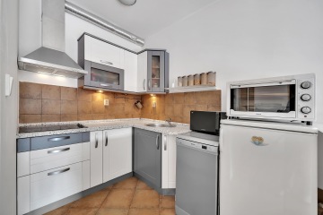 V uzavřeném areálu, který nabízí soukromí a bezpečí, Vám nabízím světlý a útulný byt o dispozici 1+kk s balkonem o výměře 47 m2. Nachází se ve 3. patře ze čtyř s výtahem. V chodbě se nachází šatní systém, pračka a koupelna s vanou a toaletou. V pokoji se nachází postel, rozkládací gauč a vstup na balkon s jižní orientací a hezkým výhledem. Kuchyňský kout je vybaven myčkou, lednicí a varnou deskou.